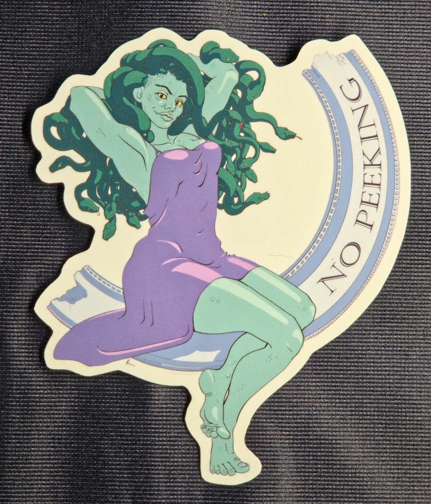 Sample Gifts: Vinyl stickers (singles $4–$8, sheets $10 with “buy 4, get 1 free”), card decks (~$35, includes a free bookmark), and stylish two-piece bandana sets (~$20).