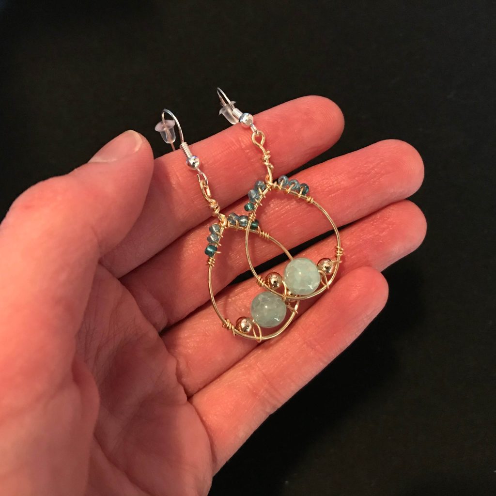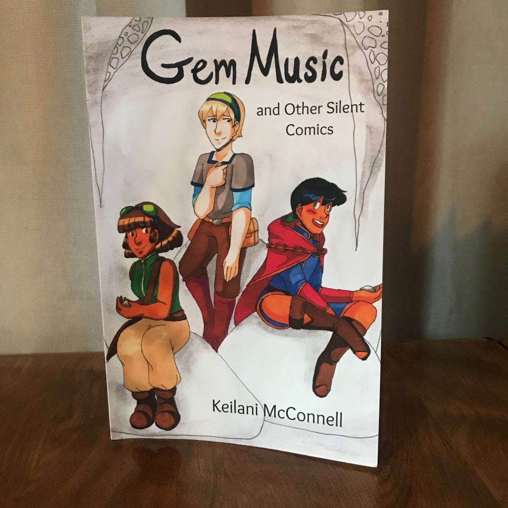 Sample Gifts: Journeys of PearlHeart (novel), Gem Music and Other Silent Comics (graphic novel), blue agate drop earrings, winter animal bookmarks, and “Mice and Spice” watercolor originals.