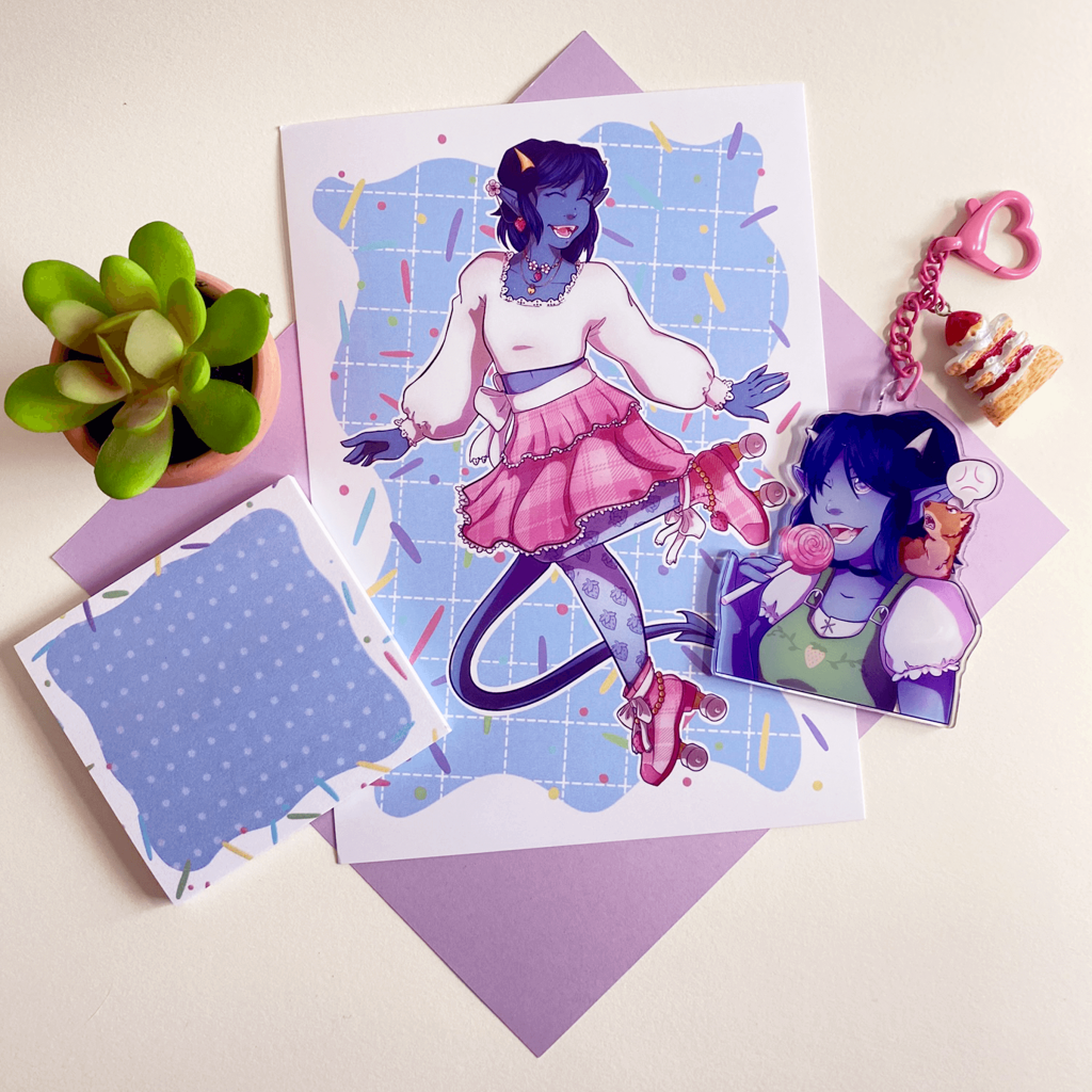 Sample Gifts: Art prints, stickers, keychains, and a sticker book.